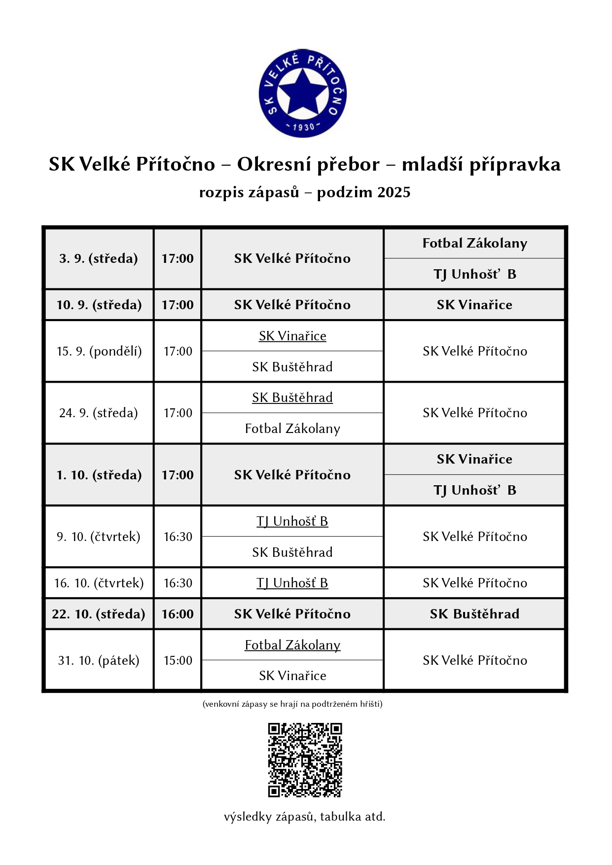 Nástěnka ROZPIS A TÝM ROZPIS STARŠÍ ŽÁCI ROZPIS MLADŠÍ ŽÁCI ROZPIS MLADŠÍ PŘÍPRAVKA INFORMACE Jednotlivé položky z klubového e-shopu můžete objednávat jednotlivě, případně jako balíčky viz. příloha níže. Na všechny položky z e-shopu lze uplatnit klubovou slevu 25% při zadání kódu: PRITOCNO25Další informace viz. níže ČLENSTVÍ FAČR Při vyplňování vyberte pole:Chci se stát členem prostřednictvím klubuJen se registrujte – příspěvek FAČR uhradí klub https://is.fotbal.cz/signup?discipline=football Platba členského příspěvku 2 500 Kč pro hráče do 18 let na rok 2025 ALMANACH A DÁRKOVÉ PŘEDMĚTY K 90.VÝROČÍ PŘÍTOČENSKÉHO FOTBALU Ceník:Almanach – 100 KčAlmanach lze zakoupit na obecním úřadě v úřední dny Pondělí nebo Středa 8-17h nebo ve stánku občerstvení na fotbalovém hřišti v provozní době.